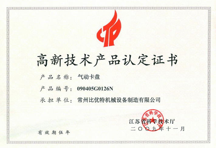 2009年11月常州“比優(yōu)特”牌氣動卡盤榮獲“江蘇省高新技術(shù)產(chǎn)品認(rèn)定證書”