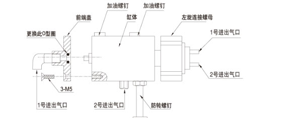 5、如果在使用時發現夾緊工件產生漏氣量較大的情況,請更換小O型圈,將前端蓋3-M5螺釘拆除,換下在前端蓋中孔內的小O型圈(規格d9×1.8氟橡膠,如購買不到,請與我公司聯系),然后再將前端蓋旋緊于原來的狀態,見示意圖;