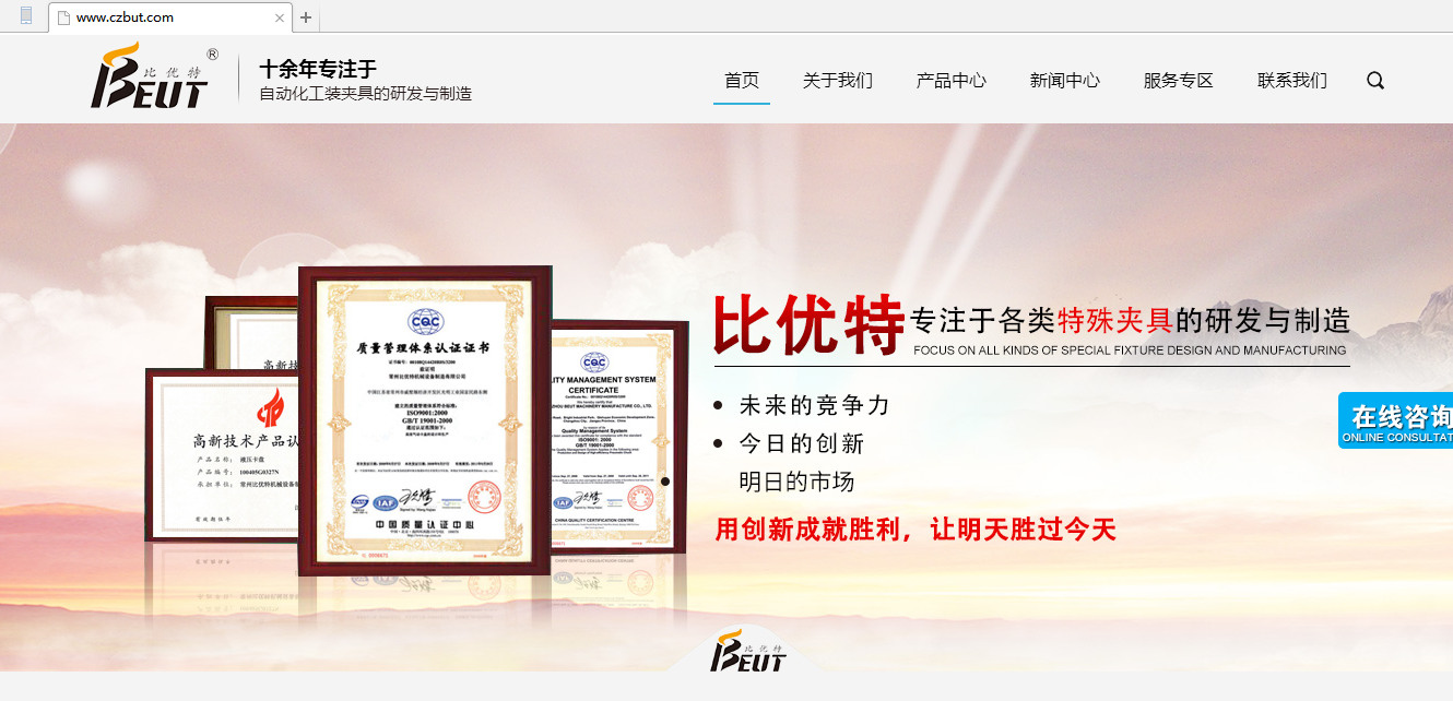 目前,常州比優特已經形成了“重點突出,多點開花”的成熟網絡宣傳模式,公司也憑借良好的企業信譽和過硬的產品實力在業界擁有了自己的品牌形象和穩定客源。現在,常州比優特已經成為一家生產氣動卡盤、液壓卡盤、加工中心組合夾具、前置式通孔卡盤、激光切割設備專用主軸夾座等機械產品的專業技術型企業,特別是卡盤產品,已經形成自己的競爭優勢和品牌效應,在行業內廣受好評。