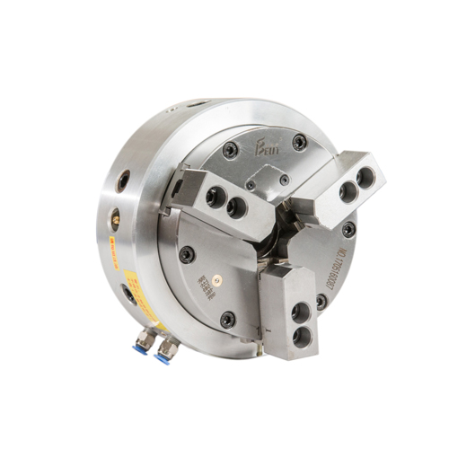 該卡盤重量輕、孔徑大、行程大、轉速高,適用于普通車床、管螺紋機床及焊接設備的配置。卡盤體即為氣缸,內置活塞、逆止閥,具有超長時間的保壓功能(長達24小時以上),通過側面旋轉進氣,實現夾緊與松開動作,斷開起源,方可工作。